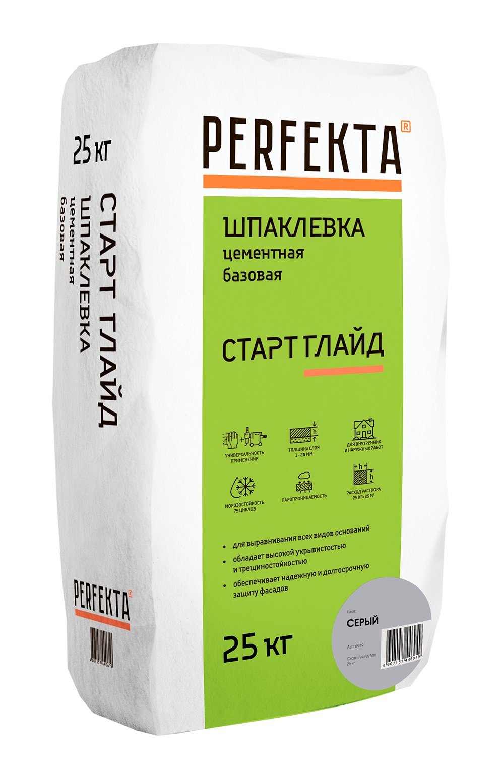ШПАКЛЕВКА ФАСАДНАЯ БАЗОВАЯ Perfekta® "СТАРТ ГЛАЙД" наносится слоем от 1 до 20 мм без образования усадочных трещин и создает гладкое, прочное основание для последующего нанесения декоративных покрытий (обои, краска, различные виды декоративных штукатурок).