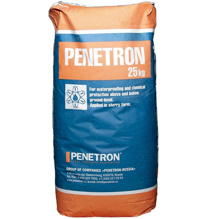 «Пенетрон» - сухая строительная гидроизоляционная проникающая смесь, предназначенная для гидроизоляции бетонных и железобетонных элементов конструкций за счёт повышения их водонепроницаемости, приобретения бетоном свойства «самозалечивания» трещин раскрытием до 0,4 мм. Гидроизоляционная проникающая смесь «Пенетрон» производится согласно ТУ 5745-001-77921756-2006. Растворная смесь «Пенетрон» наносится на тщательно очищенную и увлажненную бетонную поверхность с внутренней или внешней сторон конструкции вне зависимости от направления давления воды. Применение «Пенетрона» позволяет предотвратить проникновение воды сквозь структуру бетона с раскрытием трещин до 0,4 мм. Как вспомогательный материал «Пенетрон» используется при гидроизоляции трещин, швов, стыков, сопряжений, примыканий, вводов коммуникаций в сочетании с сухой смесью «Пенекрит» и для ликвидации напорных течей в сочетании с сухими смесями «Пенеплаг» и «Ватерплаг».