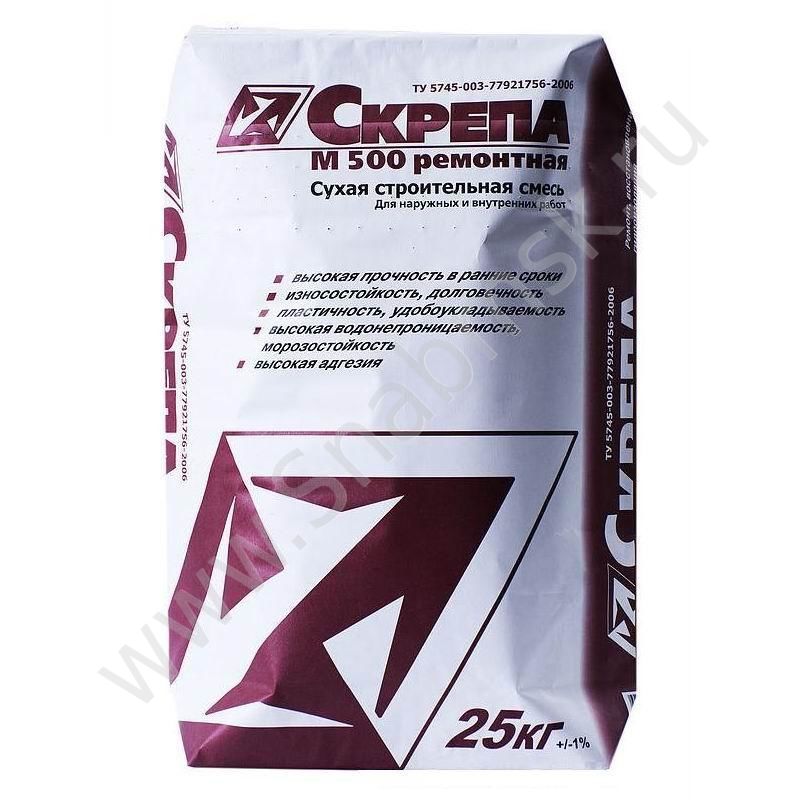 Скрепа М500 — это сухая строительная смесь для восстановления и гидроизоляции бетонных, железобетонных, каменных, кирпичных (минеральных) поверхностей. Состоит из портландцемента, гранул кварцевого песка, армирующего фиброволокна и химических добавок.