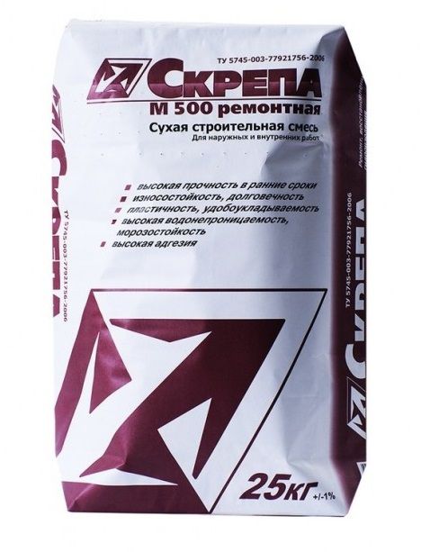Скрепа М500 – это сухая смесь, которая после смешивания с водой применяется для ремонта бетонных поверхностей и изделий, конструкций из камня и кирпича различного предназначения. Также средство пригодно для создания водонепроницаемого слоя на каменных сооружениях, выполнения гидроизоляции конструкций. Может применяться на вертикальных и горизонтальных поверхностях, потолке. Допустимая толщина нанесения от 5 до 50 мм для одного слоя, делать несколько слоев. Смесь включает кварцевый песок, портландцемент и полимерные добавки, обеспечивающие высокую адгезию к различным поверхностям.