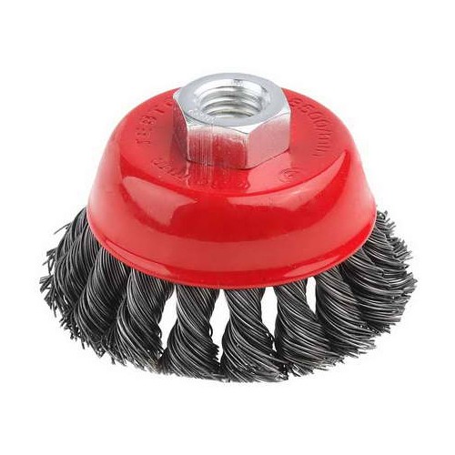 Чашеобразные корщетки с жесткой витой проволокой позволяют максимально быстро обработать большие поверхности. Витые корщетки-чашки используются для грубой обработки (зачистки) металла, бетона, дерева при помощи болгарки (УШМ) за счет большего диаметра и большей жесткости скрученной проволоки. Корщетка-чашка имеет присоединительную гайку М14 и просто накручивается на вал болгарки.