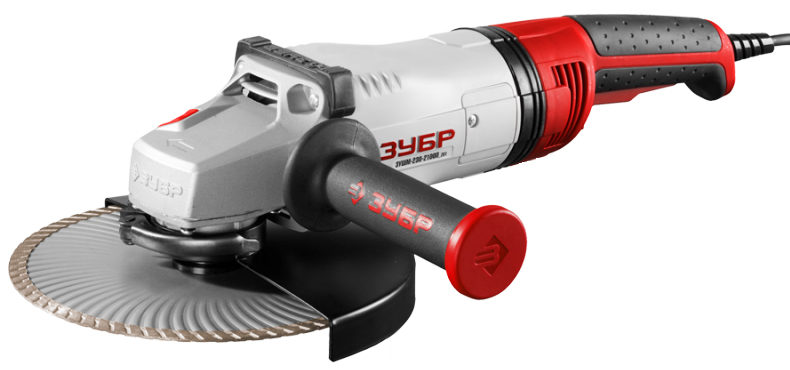Угловая шлифовальная машина 230 мм ЗУШМ-230-2100П_z01 для зачистки, шлифовки и резки металлов, обработки бетона и камня при установке соответствующих шлифовальных, отрезных, алмазных кругов.