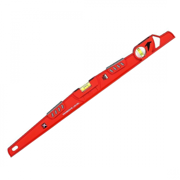 Это высококачественный измерительный прибор длиной 60 см, позволяющий обнаружить отклонение поверхности от горизонтали или вертикали. Он исключает ошибки углового зрения при измерении вертикальных поверхностей. Уровень имеет встроенную ударопрочную полиакриловую колбу. Благодаря двум резиновым вставкам разрешаются удары молотком для того, чтобы уравнять кирпичную кладку или керамическую плитку. Прибором можно пользоваться даже в труднодоступных местах.