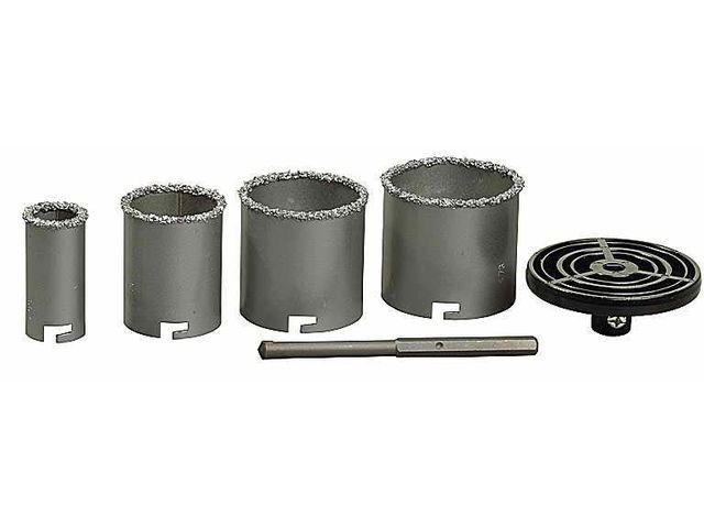 Набор KRAFTOOL Коронки кольцевые, с твердосплав напылением в наборе, 33/53/67/73 - помогает быстро и без удара просверлить отверстия различных диаметров глубиной до 55 мм, в  различных поверхностях, как, например, гипсовая плита, кирпич, плитка, бетон. Набор включает в себя четыре кольцевых коронки, державку под кольцевые коронки макс. диаметром 83 мм, а таже центрующее сверло, длина которого составляет 140 мм, с наконечником изготовленного из победита.