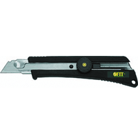 Материал – широкое сегментированное лезвие из инструментальной стали, кнопки выдвижения и фиксации сменного лезвия, металлическая направляющаяся, мягкий пластик.