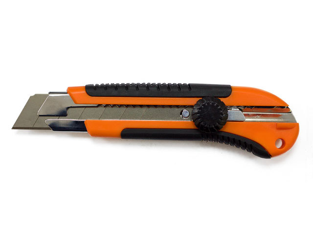 • Нож с выдвижным сегментированным лезвием, 25 мм. состоит из пластмассового упрочненного корпуса, выдвижного сегментированного лезвия из инструментальной стали шириной 25 мм, металлической направляющей, винтового фиксатора сменного лезвия.