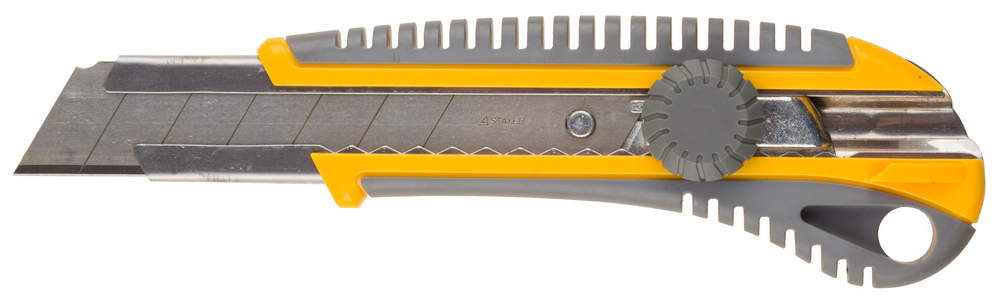 • Нож с выдвижным сегментированным лезвием, 18 мм. состоит из пластмассового упрочненного корпуса, выдвижного сегментированного лезвия из инструментальной стали шириной 18 мм, металлической направляющей, винтового фиксатора сменного лезвия.