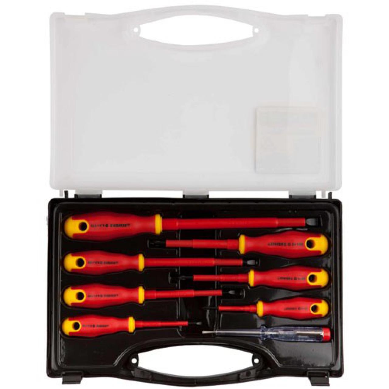 В состав набора входит 8 предметов: отвертка со шлицем SL3 длиной 75 мм, отвертка SL4 длиной 100 мм, отвертка SL5 длиной 125 мм, отвертка SL7 длиной 125 мм, отвертка PH№0 длиной 80 мм, отвертка PH№1 длиной 100 мм, отвертка PH№2 длиной 125 мм, отвертка тестер на 100-250 Вольт.