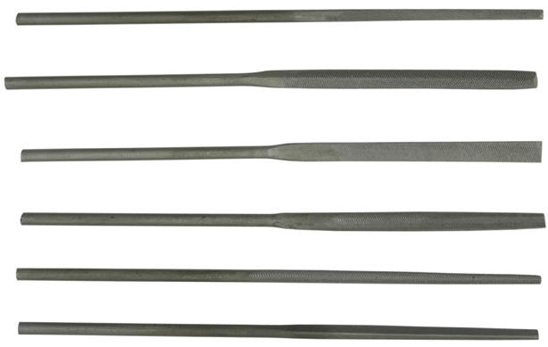 Комплект надфилей: круглый, полукруглый, квадратный, плоский, ромбовидный, квадратный.