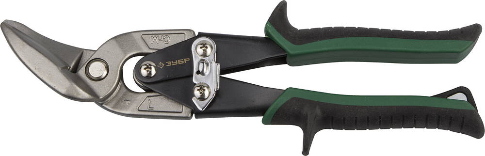 Ножницы по  металлу рычажные ЗУБР левый рез используются для  реза листовых металлов , так же можно подрезать заусенцы и вырезка выемок . Режущий элемент кованая сталь с добавлением хром-молибдена , для удобства использования ножницы снабжены двухкомпонентными ручками . Режущие  кромки ножниц дополнительно закалены индукционным током до твердости 62–65 HRC . На закаленных режущих элементах предусмотрены характерные насечки для захвата заготовки в процессе резки металла . Режущая способность ножниц : холоднокатаная сталь - 1,2 мм. , нержавеющая сталь - 0,8 мм.