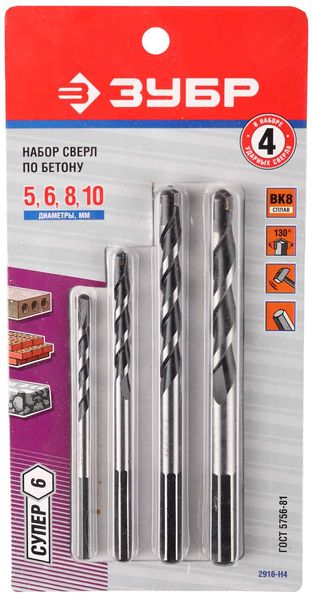 В набор ЗУБР 2916-H4 входят 4 сверла размерами 5; 6; 8; 10 мм. Они предназначены не только для ударного сверления бетона, но и других твердых строительных материалов, таких как камень и кирпич. Сверла изготовлены из инструментальной стали ВК8. У сверл угол заточки при вершине 130° и П-образная спираль. Благодаря шестигранному хвостовику, проскальзывание сверла в патроне исключено. Этот набор подойдет не только для простых бытовых работ, но и для различных случаев профессиональным строителям. Приобретение целого набора сверл позволяет сэкономить время на поиске оснастки необходимого диаметра.