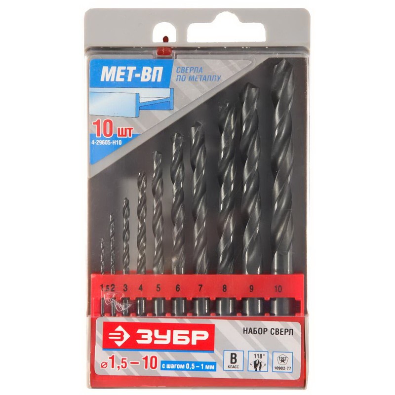 Набор ЗУБР Свёрла "МЕТ-ВП" по металлу парооксидированных, быстрорежущая сталь, 1,5-10 мм, 10 шт, в супер боксе