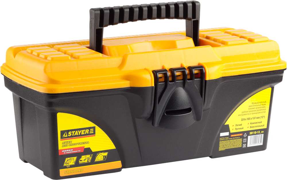 Предназначен для хранения различных инструментов и рабочих принадлежностей. Изготовлен из качественного пластика, обладающего высокой прочностью. Модель является вполне компактной и вместительной, имеет возможность запирания на замок. В крышку ящика встроены небольшие органайзеры, которые можно использовать для размещения крепежа, насадок и мелких деталей.