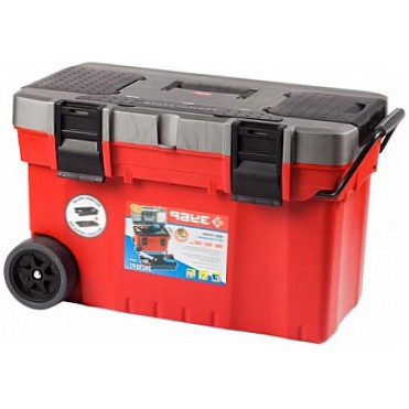 Объем этого ящика позволяет вместить в него большое количество инструментов, удобно разложить их благодаря съемной полке и легко перемещать при помощи встроенных колес и раздвижной ручки.