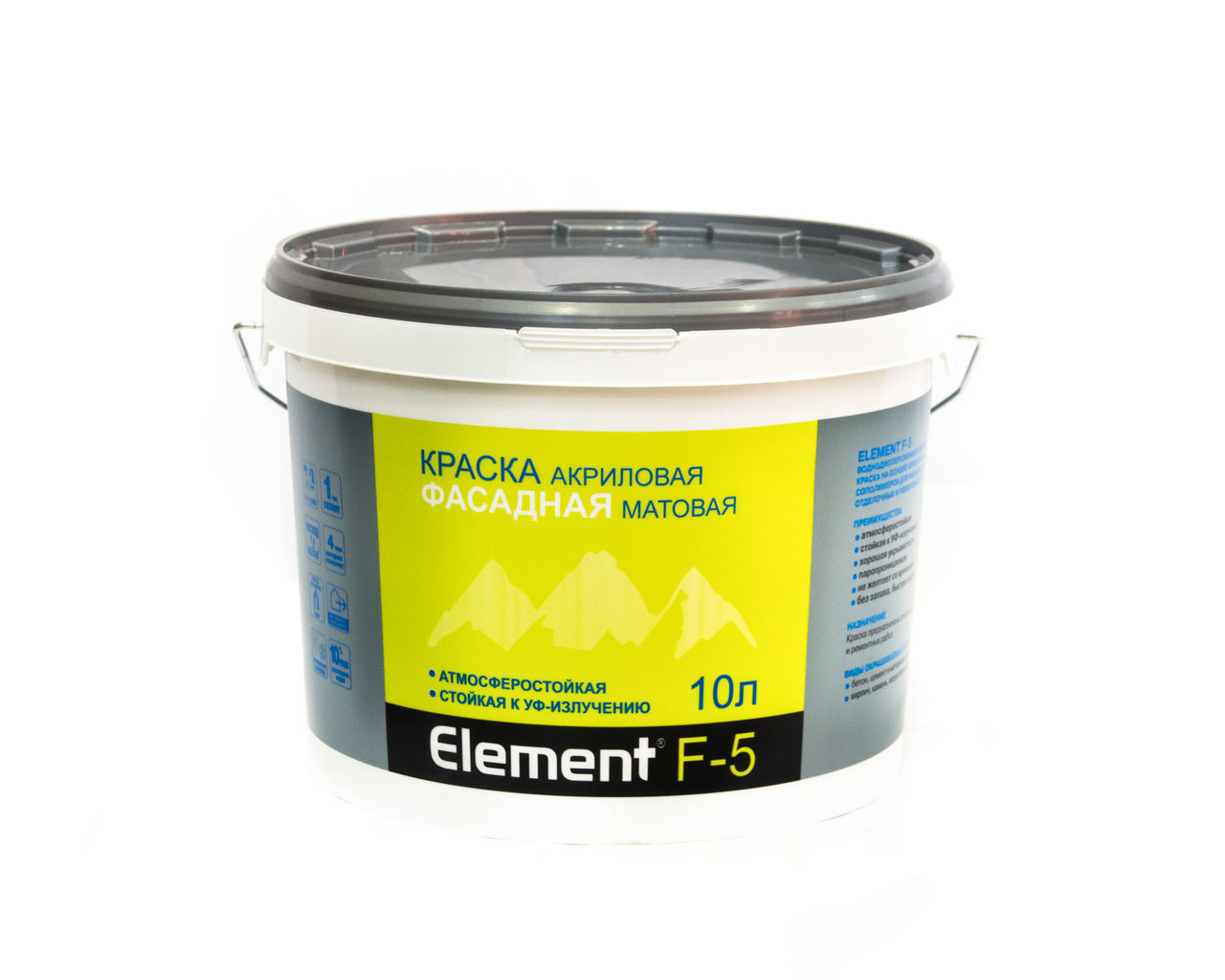 Высококачественная акриловая краска,предназначена для окрашивания фасадов. Образует стойкое  покрытие к ульрафиолетовым лучам, надолго сохраняет изначальный цвет. ElementF-5 защищает фасад от проникновения влаги снаружи, при этом обеспечивая «дыхание» стен изнутри. Благодаря этому покрытие не трескается и не отслаивается в условиях постоянно меняющихся температур и влажности.