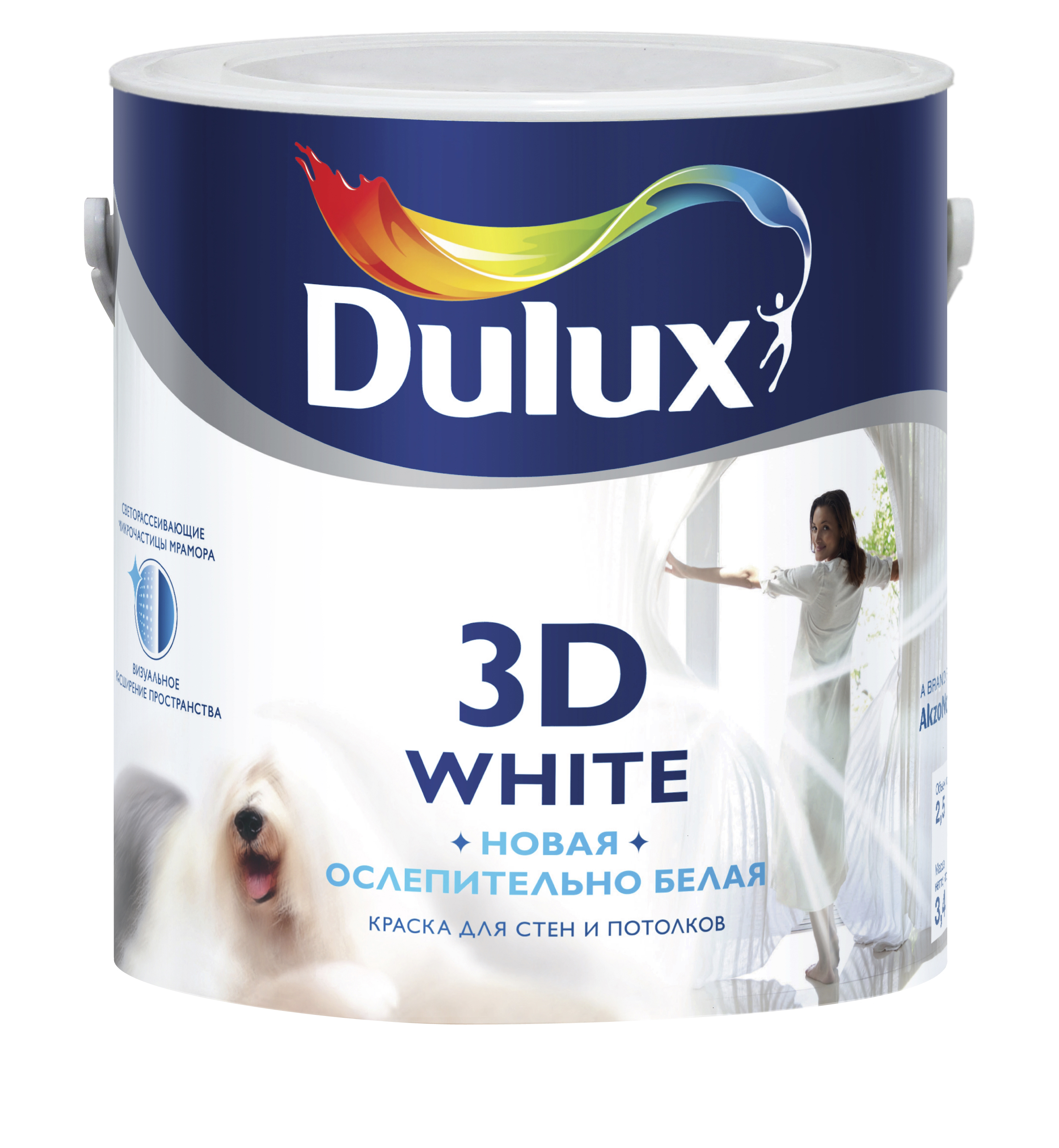 Dulux 3D White - бархатистая краска для стен и потолков. Легко наносится без брызг и подтёков, придаёт покрытию ослепительно-белый цвет. Бархатистая водно-дисперсионная краска для стен и потолков. Содержит натуральный мрамор и оптический отбеливатель, которые придают покрытю новый ослепительно-белый цвет. Он лучше рассеивает свет, усиливая естественное сияние белого и визуально расширяя пространство (3D-эффект): помещение выглядит просторнее, а потолки выше. Легко наносится без брызг и подтеков, почти не пахнет.