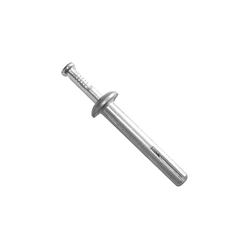 Пластиковый дюбель-гвоздь состоит из дюбеля с грибовидным стопорным бортиком и гвоздя. Распорная зона дюбеля состоит из 2-х сегментов. Этот вид дюбеля отличается быстротой монтажа, повышенными прочностными характеристиками. Применяется для монтажа подвесных потолков, реек, рамных конструкциях и т.п. к бетонным и кирпичным основаниям.