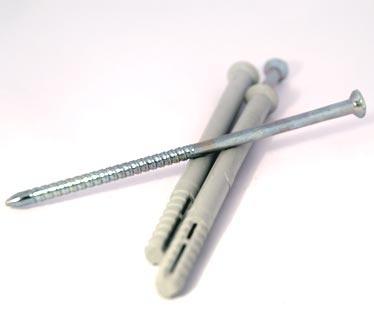 Пластиковый дюбель-гвоздь состоит из дюбеля с грибовидным стопорным бортиком и гвоздя. Распорная зона дюбеля состоит из 2-х сегментов. Этот вид дюбеля отличается быстротой монтажа, повышенными прочностными характеристиками. Применяется для монтажа подвесных потолков, реек, рамных конструкциях и т.п. к бетонным и кирпичным основаниям.