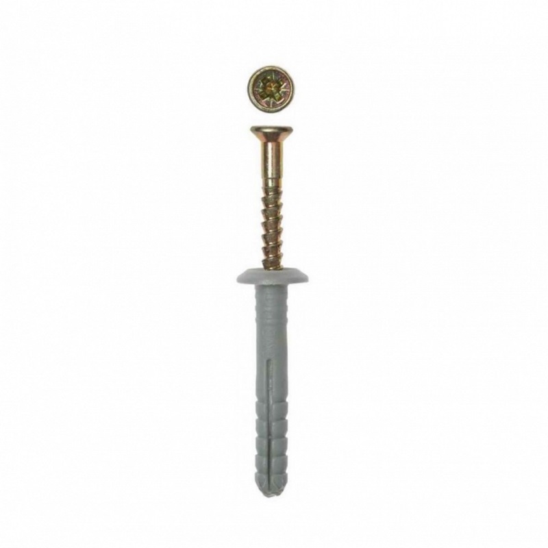 Дюбель-гвоздь состоит из дюбеля с грибовидным стопорным бортиком и гвоздя. Распорная зона дюбеля состоит из 2-х сегментов. Этот вид дюбеля отличается быстротой монтажа, повышенными прочностными характеристиками. Применяется для монтажа подвесных потолков, реек, рамных конструкциях и т.п. к бетонным и кирпичным основаниям.