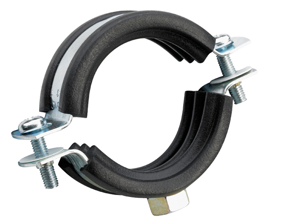 Хомут состоит из двух половин, соединенных винтами с шестигранной головкой и крестообразным шлицем, половина крепежной гайки имеет резьбу М10, а другая половина М8. Используется для крепления водопроводных и отопительных труб.