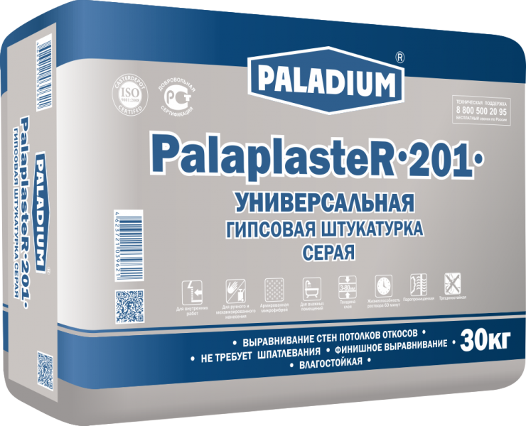 PalaplasteR-201 - Гипсовая штукатурка,изготовлена из высококачественного гипса, легкого наполнителя, микрофибра волокна и комплекса модифицирующих добавок,относится к финишным материалам. Легко выравнивается и глянцуется до состояния ровной, глянцевой поверхности для последующей декоративной отделки без дополнительного нанесения слоя финишной шпаклевки. Эти свойства позиционируют штукатурку как универсальный материал для оштукатуривания и выравнивания потолков, стен и откосов на объектах различного назначения.