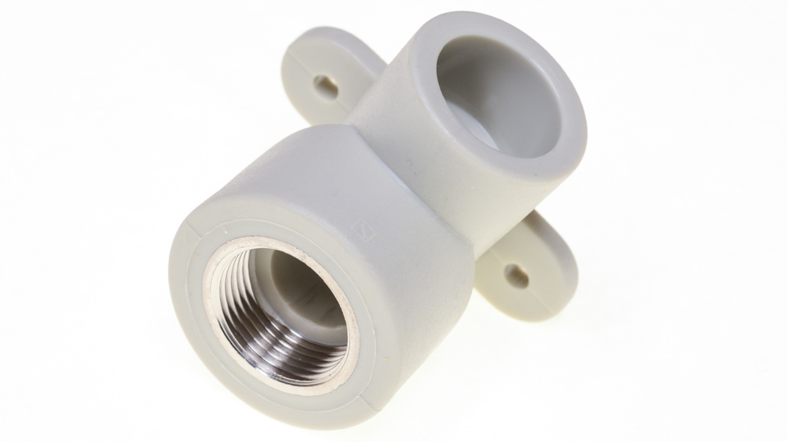 Фитинг угловой, применяемый при переходе от сварной части проводки воды к резьбовому латунному соединению и арматур с резьбой, с предусмотренным креплением к стене.