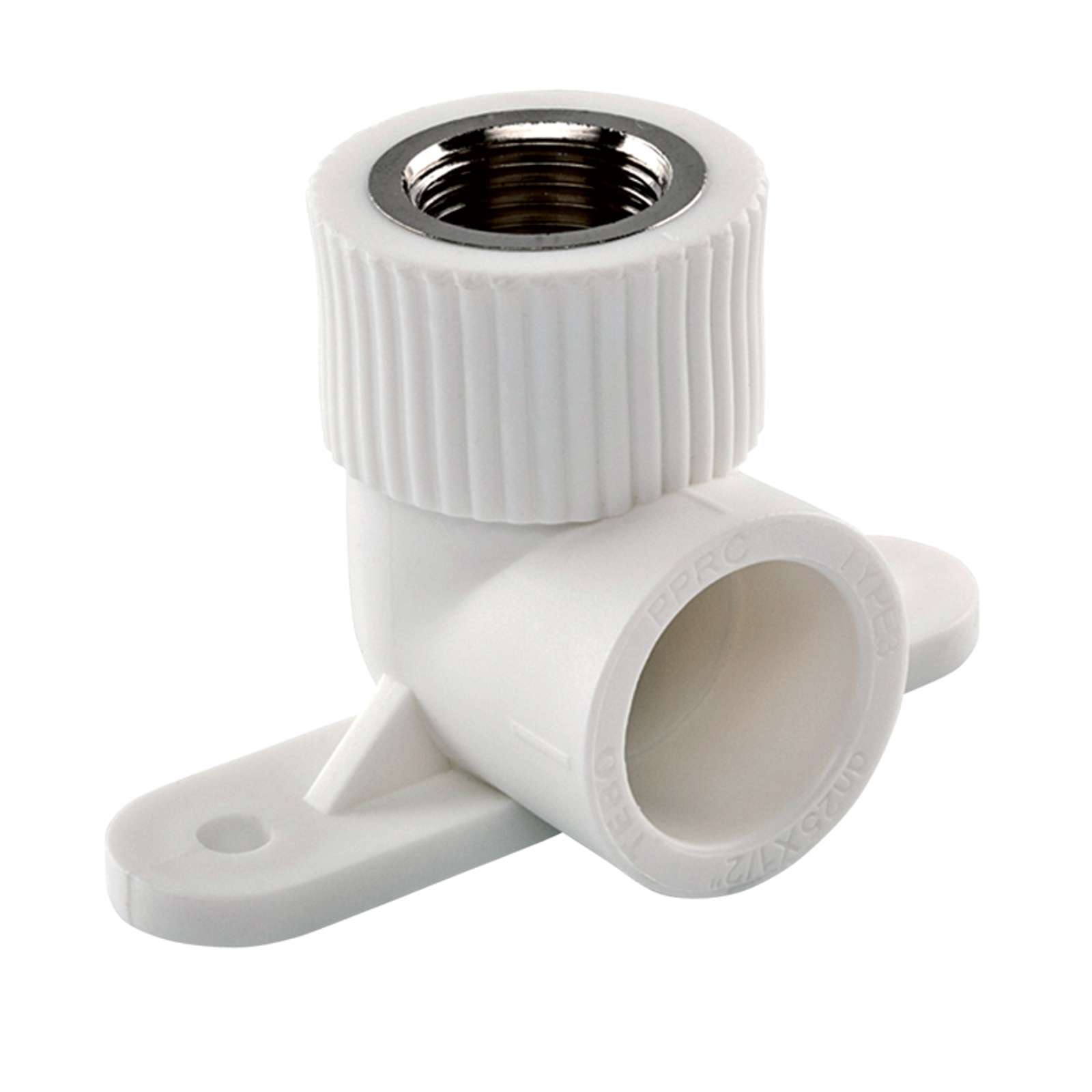 Фитинг угловой, применяемый при переходе от сварной части проводки воды к резьбовому латунному соединению и арматур с резьбой, с предусмотренным креплением к стене.
