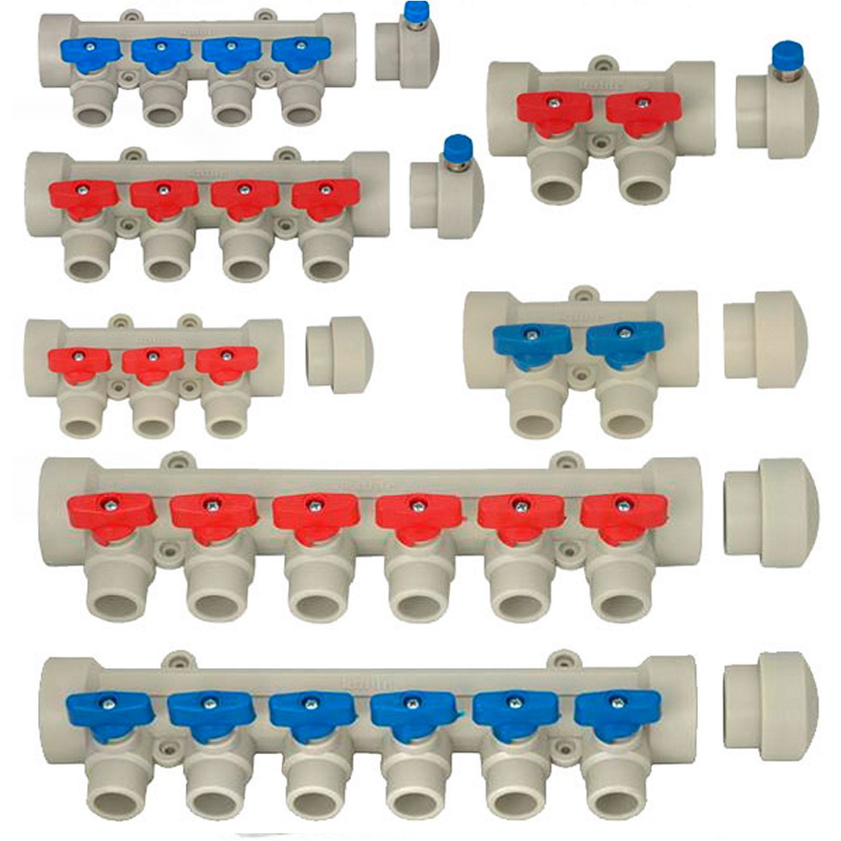 Коллектор PP-R 32х20 - 4 выхода обеспечивает распределение потоков в системах отопления, водоснабжения и технологических установках, смонтированных с применением полипропиленовых труб. Коллекторы PP-R оснащены встроенными отсечными (запорными) шаровыми кранами на отводах.