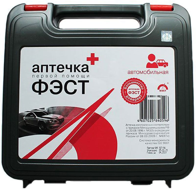Автомобильная аптечка ФЭСТ предназначена для оснащения автотранспортных средств. Аптечка служит для оказания первой само- и взаимопомощи людям, находящимся в автомобиле, микроавтобусе, автобусе. Аптечка содержит все необходимое, чтобы остановить поверхностное кровотечение, обработать рану или место ушиба, наложить жгут, сделать искусственное дыхание. Аптечка в автомобиль по своему Состав: у соответствует приказу Минздавмедпрома РФ от 20.08.1996 г. № 325 (в редакции приказа Минздравсоцразвития России от 08.09.2009 г. № 697н). Автоаптечка упакована в футляр из полистирола размером 21×21×6,5 см. В Состав: аптечки входит: 1. Жгут кровоостанавливающий 1 шт. 2. Бинт марлевый медицинский нестерильный 5 м х 5 см 2 шт. 3. Бинт марлевый медицинский нестерильный 5 м х 10 см 2 шт. 4. Бинт марлевый медицинский нестерильный 7 м х 14 см 1 шт. 5. Бинт марлевый медицинский стерильный 5 м х 7 см 2 шт. 6. Бинт марлевый медицинский стерильный 5 м х 10 см 2 шт. 7. Бинт марлевый медицинский стерильный 7 м х 14 см 1 шт. 8. Пакет перевязочный стерильный 1 шт. 9. Салфетки марлевые медицинские стерильные, не менее 16×14 см № 10 1 уп. 10. Лейкопластырь бактерицидный, не менее 4×10 см 2 шт. 11. Лейкопластырь бактерицидный, не менее 1,9×7,2 см 10 шт. 12. Лейкопластырь рулонный, не менее 1×250 см 1 шт. 13. Устройство для проведения искусственного дыхания «Рот-Устройство-Рот» 1 шт. 14. Ножницы 1 шт. 15. Перчатки медицинские нестерильные 1 пара 16. Футляр для аптечки 1 шт.