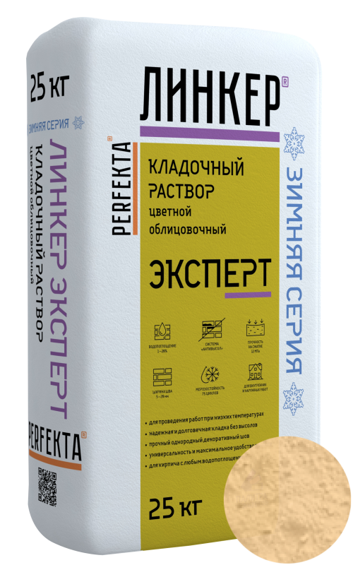 ЦВЕТНОЙ ОБЛИЦОВОЧНЫЙ КЛАДОЧНЫЙ РАСТВОР Perfekta® "ЛИНКЕР Эксперт" ЗИМНЯЯ СЕРИЯ предназначен для выполнения работ при отрицательных температурах по созданию прочного, долговечного, паропроницаемого, водо- и морозостойкого кладочного шва между элементами кладки с любым водопоглощением (полнотелый и пустотелый облицовочный керамический и клинкерный кирпич, рядовой керамический и силикатный кирпич, кирпичи или блоки из бетона и натурального камня) с одновременной декоративной расшивкой швов кладки.
