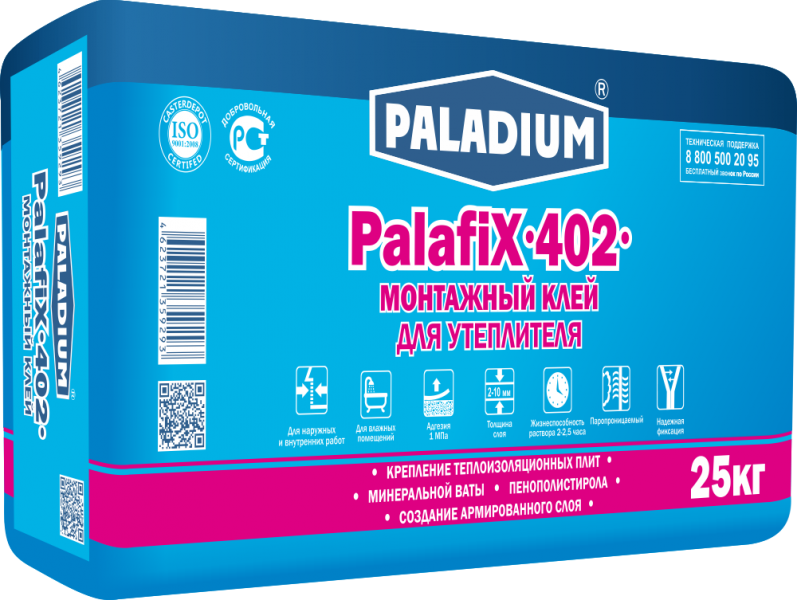 Монтажный клей PALADIUM PalafiX-402 обеспечивает долговечное соединение в зоне высоких динамических нагрузок. Состав демонстрирует одинаковую эффективность и прочность внутри помещений и при наружной укладке утеплителя. Монтажный клей PALADIUM PalafiX-402 характеризуется морозостойкостью и устойчивостью к влаге. При этом он не снижает паропроницаемость систем утепления при внешнем и внутреннем монтаже теплоизоляционных материалов.
