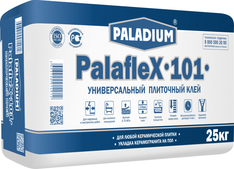 Плиточный клей PALADIUM PalafleХ-101 – сухая облицовочная клеевая смесь, изготавливается из высококачественного цемента, фракционированного песка и комплекса модифицирующих добавок. Базовый экономичный PalafleХ-101 предназначен для облицовки стен и пола мелко- и среднеформатной кафельной, керамической и мозаичной плиткой, а также для укладки напольных плит из стандартного керамогранита размером не более 30х30см на полах без подогрева. Наносится на основания: бетонное (монолитное, панельное), кирпичное, газо-, пенобетонное и другое сильновпитывающее, оштукатуренное (гипсовое, цементное). PalafleХ-101 относится к категории тонких плиточных клеев. Одна из наиболее важных характеристик плиточного клея это – адгезия (прочность сцепления или клеящаяся способность) к основанию. Именно поэтому монтаж стандартной плитки нужно производить на клей с адгезией не менее 0,5МПа. Это тот показатель, при котором плиточный клей должен не только приклеивать, но и удерживать даже самую простую керамическую плитку долгие года, несмотря на вибрацию и периодические нагрузки. Обращайте внимание на толщину нанесения плиточного клея, указанную производителем. Если толщина клея 2-6мм, то он предназначен под нанесение зубчатым шпателем без одновременного выравнивания основания. В случае его толстослойного применения возможно образование «эффекта карамели», при котором внутренний слой раствора не твердеет, а сохраняет подвижность. Как результат – плитка может смещаться, а слой клея твердеть дольше заявленного. При необходимости объединить процессы приклеивания и выравнивания поверхности используйте толстослойный плиточный клей PALADIUM PalafleХ-103.