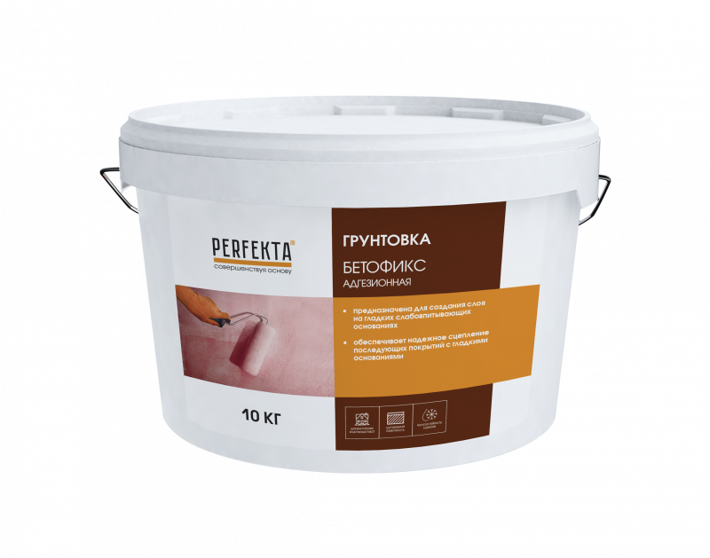 Грунтовка Perfekta® «Бетофикс» предназначена для подготовки плотных, не впитывающих влагу оснований (монолитный бетон, керамическая плитка, старые масляные и алкидные покрытия и т.п.) перед нанесением гипсовых и цементных выравнивающих штукатурок, стяжек, плиточных клеев. Делает гладкие поверхности шероховатыми, прочно сцепляет наносимый материал с основанием. Применяется для наружных и внутренних работ. Обладает высокой паропроницаемостью, быстро высыхает, не имеет запаха, не токсична.