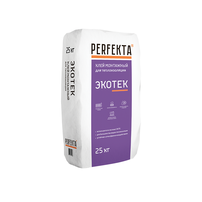 Клей для теплоизоляции Perfekta Экотек представляет собой гомогенизированную сухую смесь на основе высококачественного цемента и множества модифицирующих добавок, совокупность которых и придает ему такие высокие качественные показатели как и потребительские свойства. Приклеивая фасадную теплоизоляцию на клей Перфекта Экотек, Вы получаете прочное соединение, обладающее хорошей паропроницаемостью, водостойкостью и морозостойкостью.