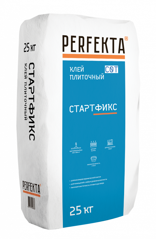 Клей плиточный Перфекта Стартфикс предназначен для укладки на пол и стены всех видов керамической плитки весом до 350 г/100 см². Для облицовки полов керамогранитом. Используется при облицовке фасадов выше цокольной части и помещений с любым уровнем влажности.