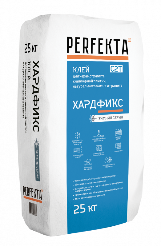 КЛЕЙ Perfekta® “ХАРДФИКС” ЗИМНЯЯ СЕРИЯ предназначен для выполнения работ при отрицательных температурах по укладке крупноформатных плит из мрамора и гранита, натурального и искусственного камня, керамогранита, клинкерной и керамической плитки весом до 2000 г/100 см².