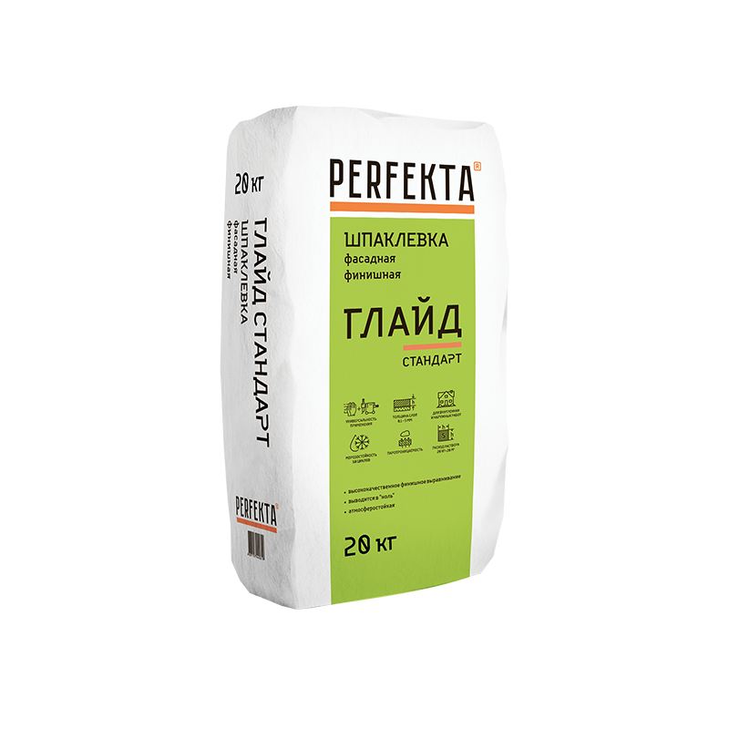 Perfekta® “Глайд Стандарт” предназначена для высококачественного финишного выравнивания фасадов зданий (выше цокольной части), а также стен и потолков из бетона, ячеистого бетона, оштукатуренных поверхностей, ГКЛ, ГВЛ, ЦСП, СМЛ под последующее нанесение декоративных покрытий в сухих и влажных помещениях. Используется также для заделки трещин, выбоин, углублений.