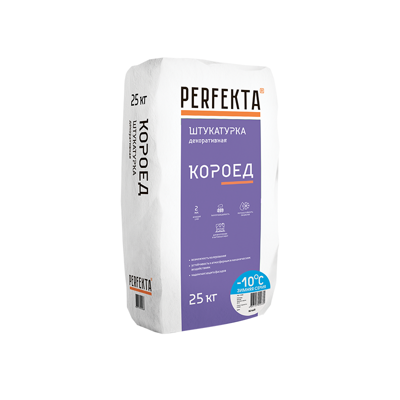 ШТУКАТУРКА ДЕКОРАТИВНАЯ Perfekta® "КОРОЕД" ЗИМНЯЯ СЕРИЯ обладает высокой пластичностью, прочностью и адгезией. После высыхания образует надежный трещиностойкий, паропроницаемый, атмосферостойкий и морозостойкий слой, надежно защищающий фасад от механических повреждений и воздействия неблагоприятных климатических условий, пригодный под последующую окраску или пропитку гидрофобизирующими составами.