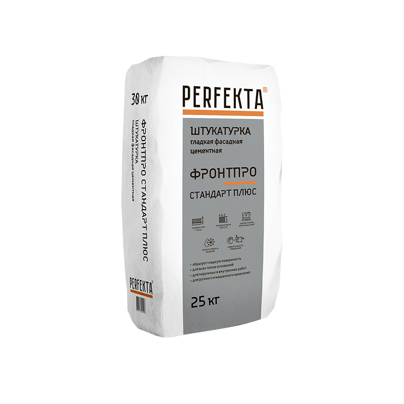 ГЛАДКАЯ ФАСАДНАЯ ЦЕМЕНТНАЯ ШТУКАТУРКА Perfekta® "ФРОНТПРО" Стандарт PLUS предназначена для выравнивания стен внутри и снаружи зданий (фасадов, подвалов и помещений с любой степенью влажности). ГЛАДКАЯ ФАСАДНАЯ ЦЕМЕНТНАЯ ШТУКАТУРКА Perfekta® "ФРОНТПРО" Стандарт PLUS используется под последующую отделку: финишное тонкослойное шпаклевание, отделку декоративными штукатурками, плиточную облицовку. Образует гладкую поверхность, которая подходит под окрашивание без дополни- тельного шпаклевания. ГЛАДКАЯ ФАСАДНАЯ ЦЕМЕНТНАЯ ШТУКАТУРКА Perfekta® "ФРОНТПРО" Стандарт PLUS обладает высокой трещиностойкостью и обеспечивает надежную защиту фасадов от атмосферных воздействий. Рекомендуется для нанесения с помощью всех видов штукатурных станций, а так же для ручного нанесения. Основания: – бетонные; – цементно-известковые и цементно-песчаные; – газобетон и пенобетон; – кирпичная и каменная кладка.