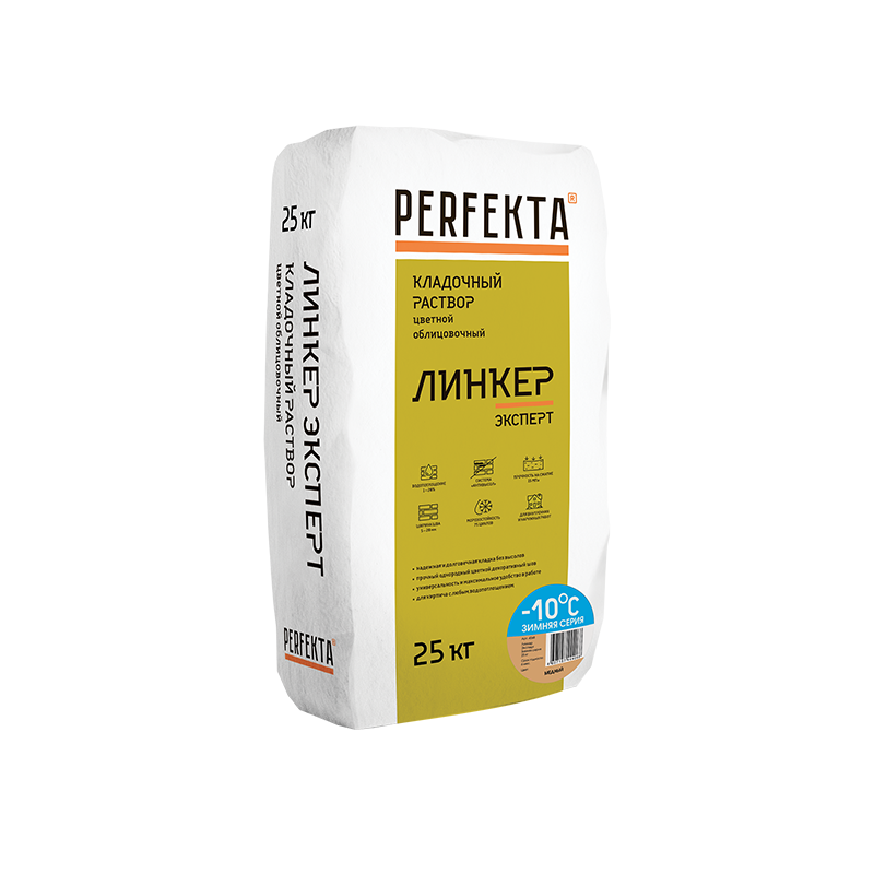 ЦВЕТНОЙ ОБЛИЦОВОЧНЫЙ КЛАДОЧНЫЙ РАСТВОР Perfekta® "ЛИНКЕР Эксперт" ЗИМНЯЯ СЕРИЯ предназначен для выполнения работ при отрицательных температурах по созданию прочного, долговечного, паропроницаемого, водо- и морозостойкого кладочного шва между элементами кладки с любым водопоглощением (полнотелый и пустотелый облицовочный керамический и клинкерный кирпич, рядовой керамический и силикатный кирпич, кирпичи или блоки из бетона и натурального камня) с одновременной декоративной расшивкой швов кладки.