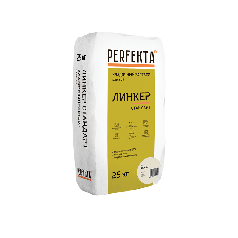 ЦВЕТНОЙ КЛАДОЧНЫЙ РАСТВОР Perfekta® "ЛИНКЕР Стандарт" предназначен для монтажа кладочных элементов с водопоглощением от 5 до 15 % (полнотелый и пустотелый облицовочный керамический кирпич, рядовой керамический и плотный силикатный кирпич, кирпичи или блоки из бетона и натурального камня).