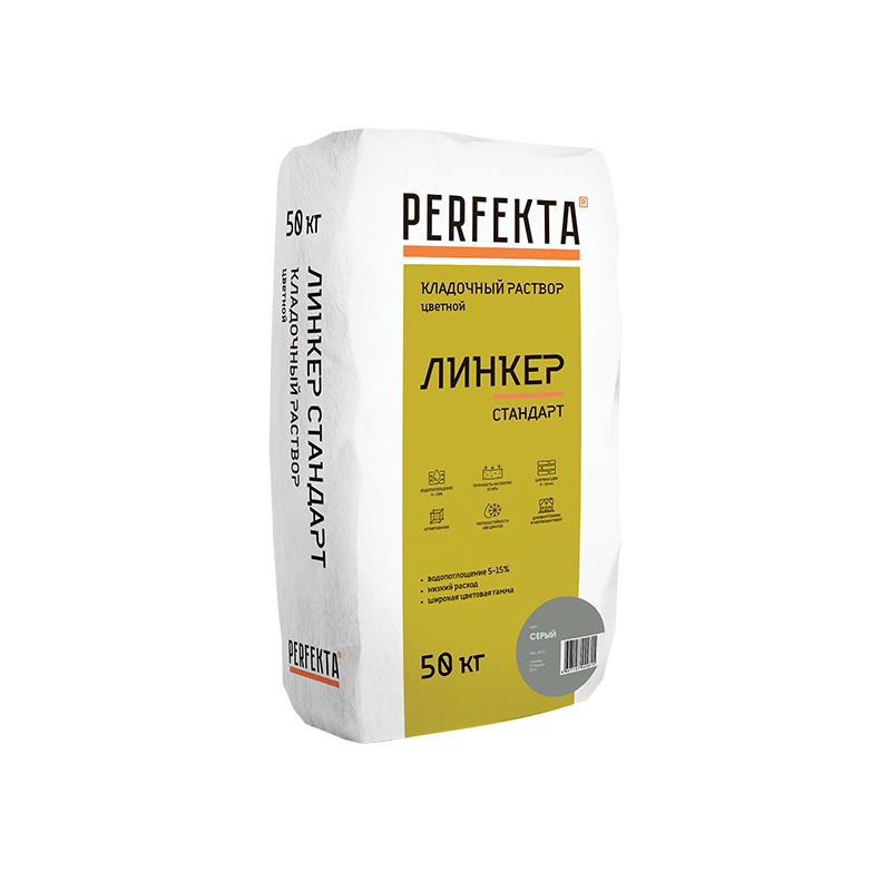 ЦВЕТНОЙ КЛАДОЧНЫЙ РАСТВОР Perfekta® "ЛИНКЕР Стандарт" предназначен для монтажа кладочных элементов с водопоглощением от 5 до 15 % (полнотелый и пустотелый облицовочный керамический кирпич, рядовой керамический и плотный силикатный кирпич, кирпичи или блоки из бетона и натурального камня).