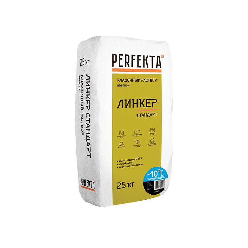ЦВЕТНОЙ КЛАДОЧНЫЙ РАСТВОР Perfekta® "ЛИНКЕР Стандарт" ЗИМНЯЯ СЕРИЯ предназначен для выполнения работ при отрицательных температурах по монтажу кладочных элементов с водопоглощением от 5 до 15 % (полнотелый и пустотелый облицовочный керамический кирпич, рядовой керамический и плотный силикатный кирпич, кирпичи или блоки из бетона и натурального камня).