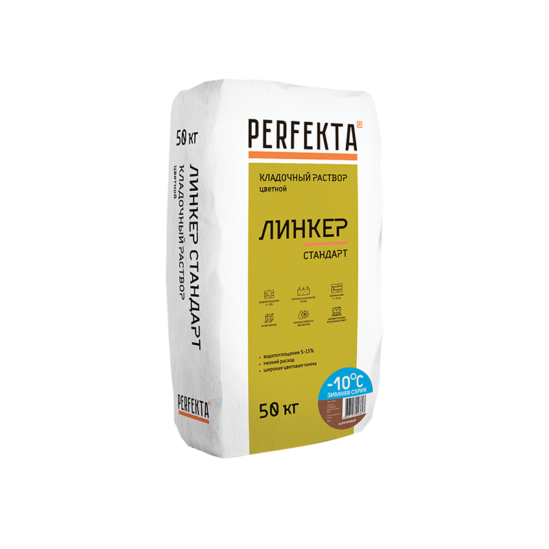 ЦВЕТНОЙ КЛАДОЧНЫЙ РАСТВОР Perfekta® "ЛИНКЕР Стандарт" ЗИМНЯЯ СЕРИЯ предназначен для выполнения работ при отрицательных температурах по монтажу кладочных элементов с водопоглощением от 5 до 15 % (полнотелый и пустотелый облицовочный керамический кирпич, рядовой керамический и плотный силикатный кирпич, кирпичи или блоки из бетона и натурального камня).