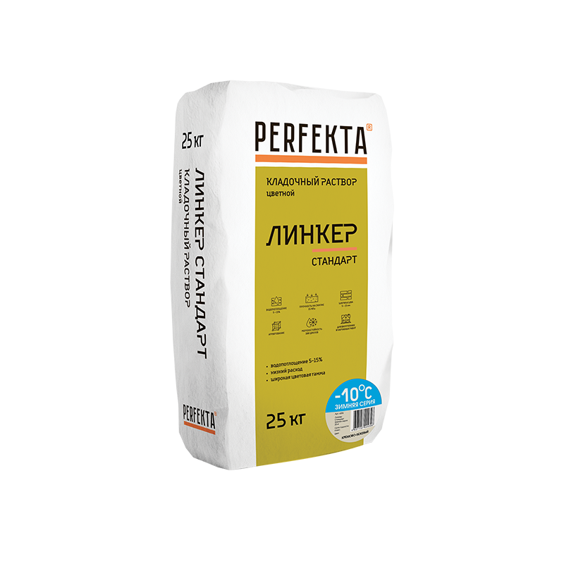 ЦВЕТНОЙ КЛАДОЧНЫЙ РАСТВОР Perfekta® "ЛИНКЕР Стандарт" ЗИМНЯЯ СЕРИЯ предназначен для выполнения работ при отрицательных температурах по монтажу кладочных элементов с водопоглощением от 5 до 15 % (полнотелый и пустотелый облицовочный керамический кирпич, рядовой керамический и плотный силикатный кирпич, кирпичи или блоки из бетона и натурального камня).