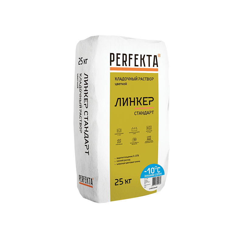 ЦВЕТНОЙ КЛАДОЧНЫЙ РАСТВОР Perfekta® "ЛИНКЕР Стандарт" ЗИМНЯЯ СЕРИЯ предназначен для выполнения работ при отрицательных температурах по монтажу кладочных элементов с водопоглощением от 5 до 15 % (полнотелый и пустотелый облицовочный керамический кирпич, рядовой керамический и плотный силикатный кирпич, кирпичи или блоки из бетона и натурального камня).